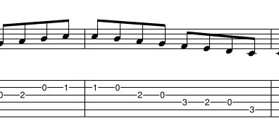 Now if we expand the fretboard a little more, we can get more out of one position, slowly getting out of the box. The next two examples show expansion of the C major scale. We’re still using the scale, we’re just getting way more out of it. The scale continues into the B and E string, stopping at a high A, then descends below middle C, all the way to G, and back.