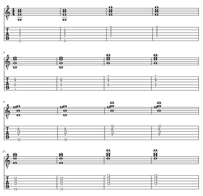 Dominant 7th Voicings We’ve checked out Major 7th, Minor 7th, now it’s time for some Dominants. These are all based on G dominant 7th. The spelling for the chord is G-B-D-F. Remember, no matter how the letters are organized, it can still be referred to as a G7 chord. Often times on a lead sheet…