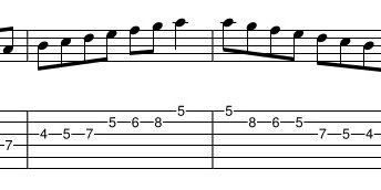 In the first example we have a sequence. We use the first 5 notes of the scale, then descend back to the starting position. The sequence repeats three times, then in measure 4 we use a similar sequence starting on a different pitch (C).